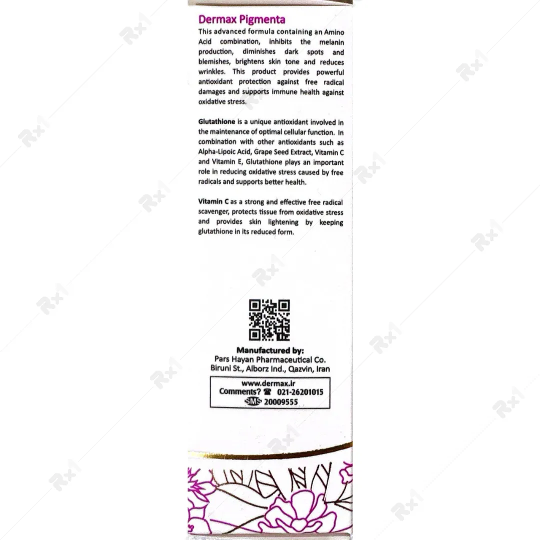 کپسول روشنکننده پوست پیگمنتا درمکس (Dermax Pigmenta) یکی از مکملهای تخصصی و علمی برای افزایش درخشش پوست، کاهش لکها و حفظ سلامت سلولی پوست است. این محصول ساخت شرکت معتبر پارس حیان بوده و در بستههای ۳۰ عددی تحت برند درمکس تولید میشود.