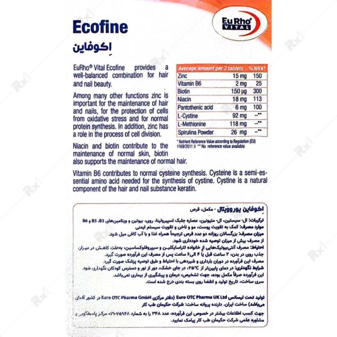 فرمولاسیون قرص اکوفاین شامل ترکیبات کلیدی مانند بیوتین، روی، سلنیوم، ویتامین‌های گروه B، و عصاره دم‌اسب (Horsetail Extract) است که نقش مهمی در تغذیه فولیکول مو، تحریک ساخت کراتین و کلاژن، و محافظت از سلول‌های پوست در برابر استرس اکسیداتیو دارند.