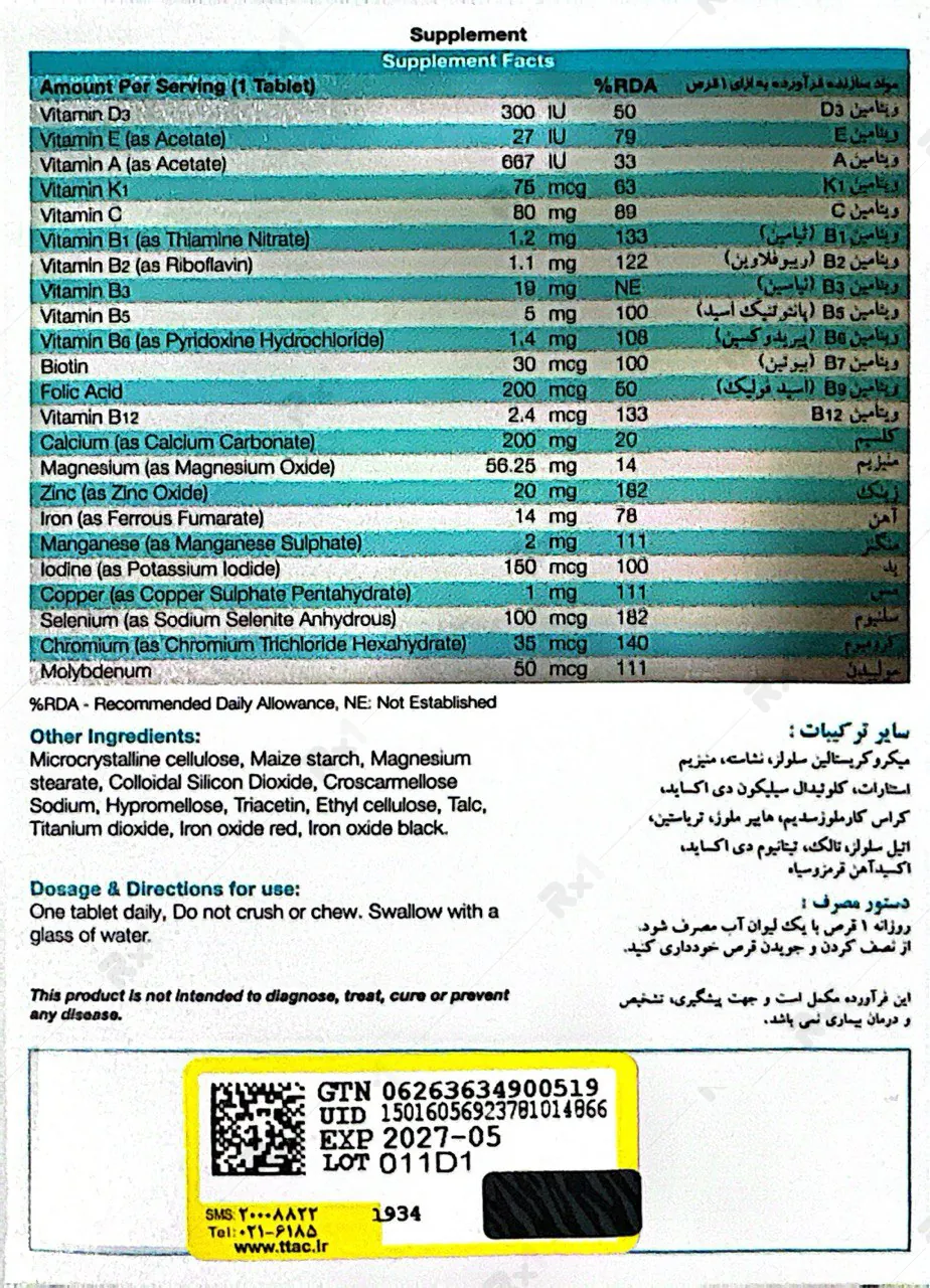 ویتامین D3 (300 IU): کلیدیترین عنصر برای جذب کلسیم و فسفر و پیشگیری از پوکی استخوان در سنین بالا. همچنین نقش مهمی در ترشح انسولین دارد.