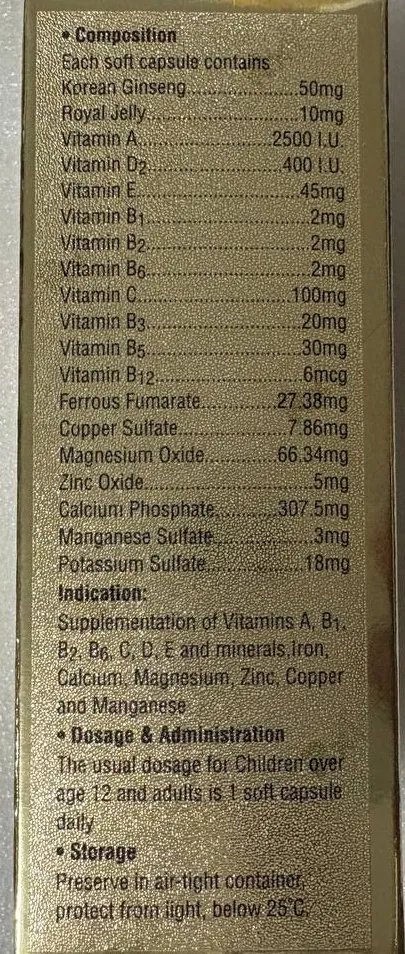 - ویتامینها: این مکمل حاوی ویتامین A برای تقویت بینایی و سلامت پوست، ویتامین D برای جذب کلسیم و استحکام استخوانها، ویتامین E و ویتامین C به عنوان آنتیاکسیدانهای قوی برای محافظت از سلولها و تقویت سیستم ایمنی، و تمامی ویتامینهای گروه B (شامل B1, B2, B3, B5, B6, B12) برای متابولیسم انرژی، عملکرد صحیح سیستم عصبی و کاهش خستگی است.